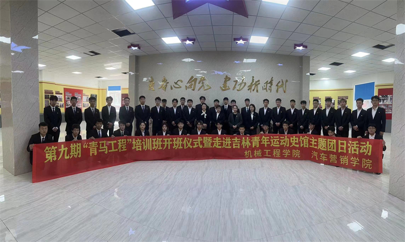 为深入学习贯彻习近平新时代中国特色社会主义思想,引导青年学生进一步坚定理想信念,提升综合素质,4月20日,机械工程学院、汽车营销学院联合举办第九期“青马工程”培训班开班仪式暨走进吉林青年运动史馆主题团日活动。机械工程学院团总支书记苏冰玉、汽车营销学院团总支书记戚旭娣、指导教师及全体青马学员参加活动。仪式由汽车营销学院青马学员杨超主持。
