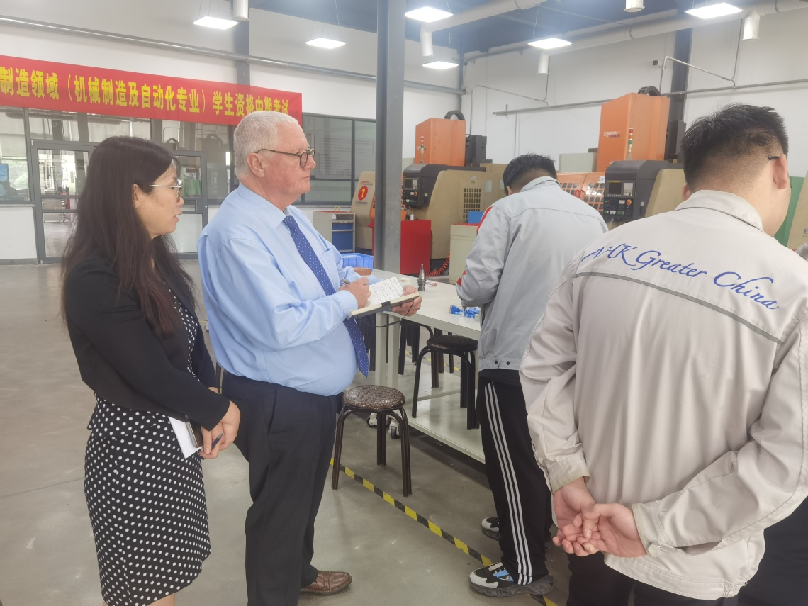 20日上午,德国专家在校领导的陪同下,对普通加工实训区、电气安装实训室等双元制实训基地进行了实地踏查。基地内整洁的环境、先进的设备以及对标德国高标准的一体化实训室获得专家一致好评。