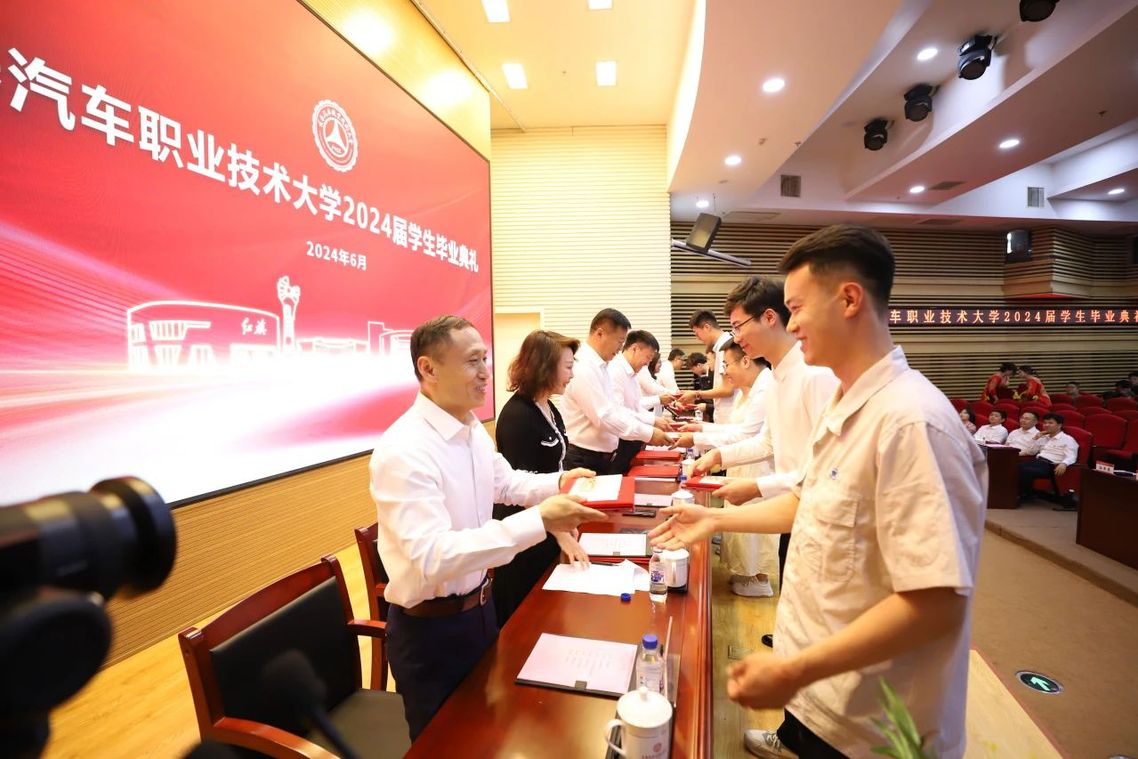 副校长韩萍宣读关于准予2024届3304名学生毕业的决定。副校长丁卓宣读关于表彰2024届优秀毕业生的决定。学校领导班子成员为毕业生颁发证书和纪念品。