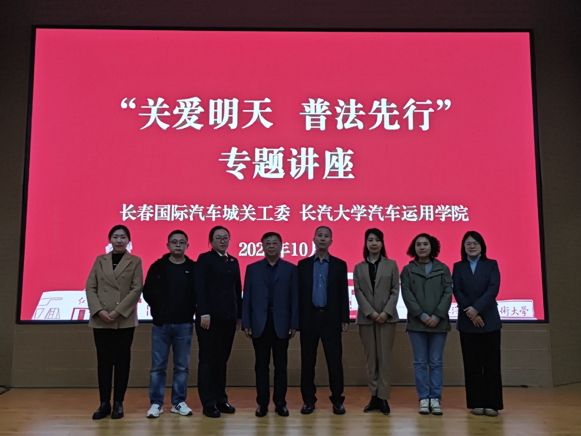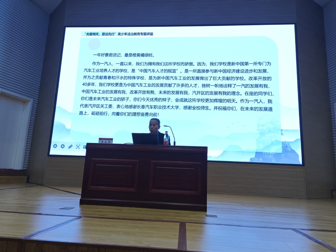 10月15日,长春市汽开区关工委联合我校汽车运用学院开展“关爱明天 普法先行”青少年法治教育专题讲座。长春市汽开区关工委副主任兼秘书长李枫林、副主任王永军、办公室主任马书丽、汽开区检察院检察官王雪、我校汽车运用学院党总支副书记苏蔷、学校关工委主任孙微出席本次活动。