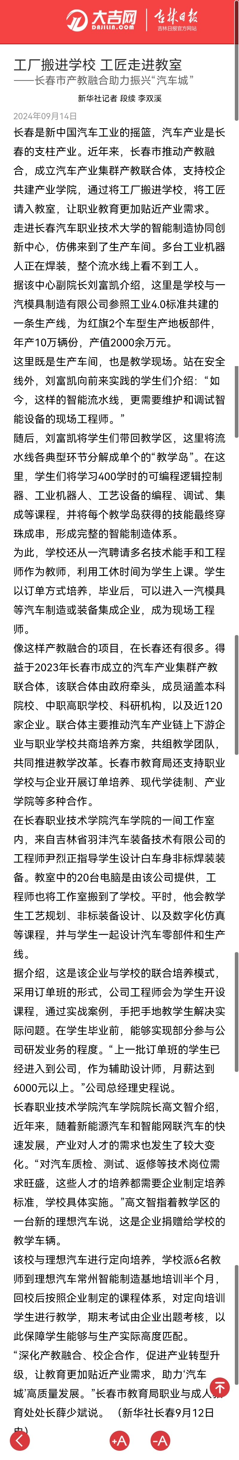 吉林日报——工厂搬进学校 工匠走进教室——长春市产教融合助力振兴“汽车城”