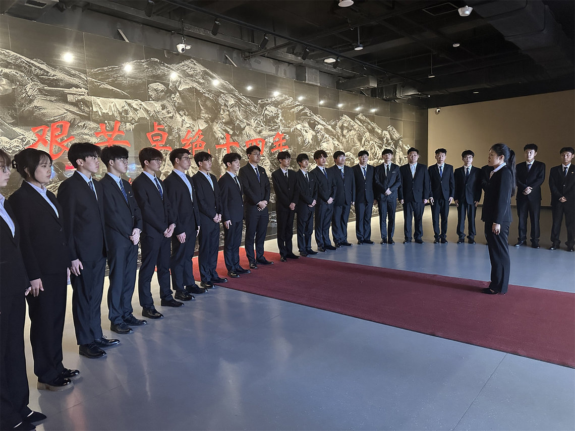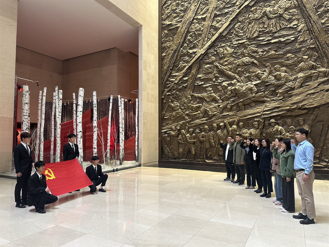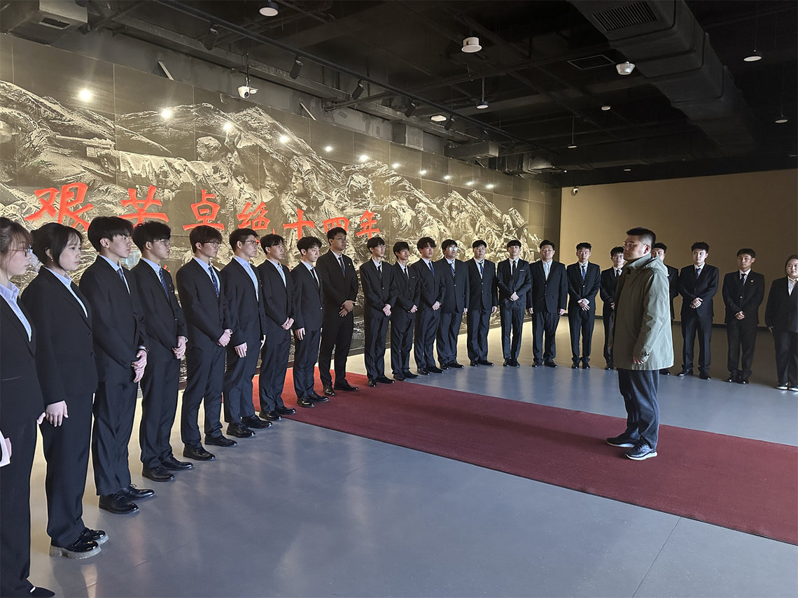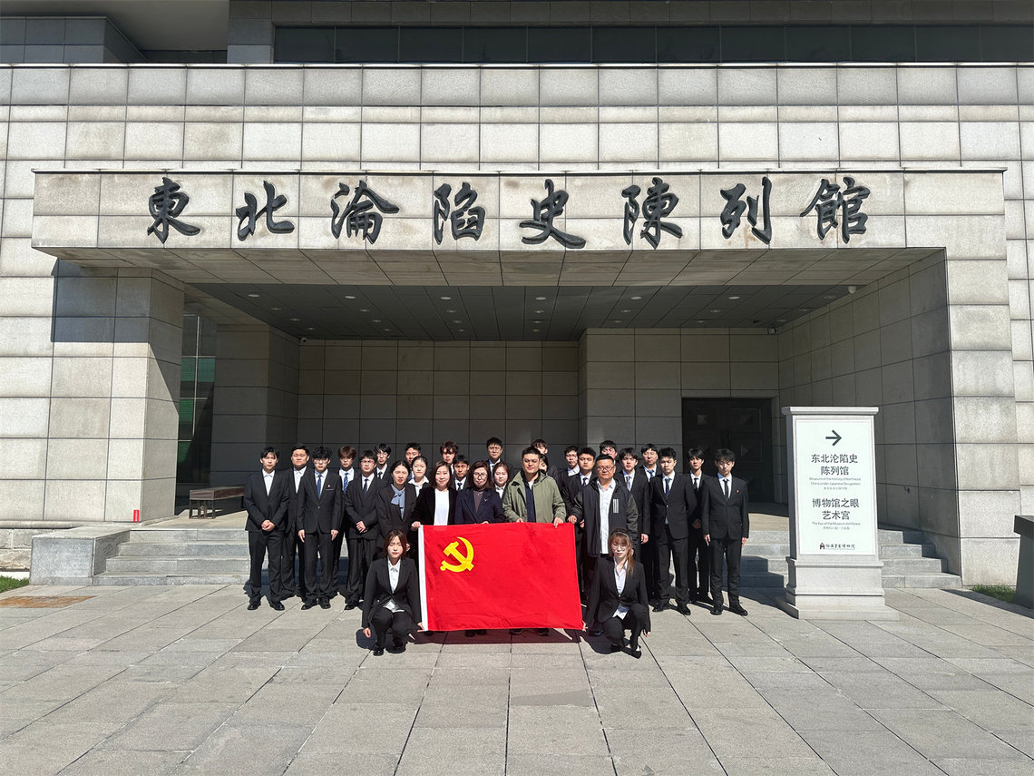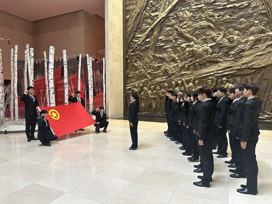 在东北沦陷史陈列馆,全体师生认真参观馆内文物、图片、档案、场景复原及影像,深入了解“九·一八”事变后东北的苦难与伤痛。参观结束后,全体师生整齐列队,面向鲜红的党旗与团旗,庄重地重温了入党、入团誓词。激昂的宣誓声在馆内回荡,那是对党的忠诚誓言,是为共产主义事业奋斗的坚定决心,也是新时代青年学子勇担使命的庄严承诺。