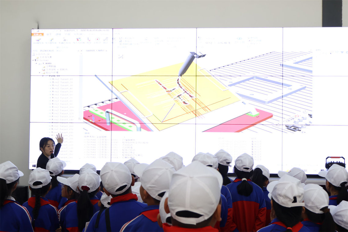 师生们随后参观了电气工程学院工业机器人基地与智能制造协同创新中心。电气工程学院院长梁法辉介绍了学院在汽车职业教育领域的办学特色与成果,在现代化工厂模拟场景中,高速运转的机械臂、精准协作的智能生产线令孩子们目不暇接。梁法辉表示,此次研学让课本知识“活”了起来,也让孩子们对工业4.0有了具象认知。 韩昊宏老师向小朋友们介绍了工业机器人的工作原理并引导孩子们现场演示;柏淑军老师通过机器人的动态展示,引导同学们思考科技如何服务于社会生产与生活,激发了大家对“工程师梦想” 的向往。