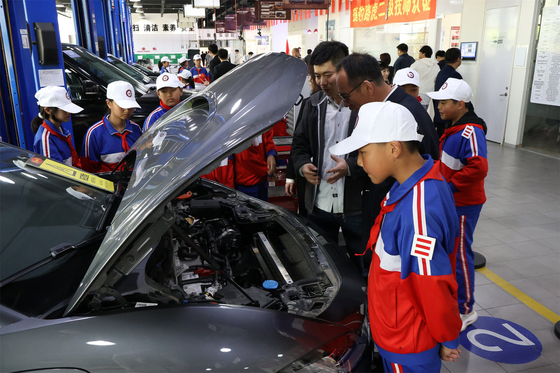 在交通工程学院捷豹路虎基地,项目负责人叶鹏为同学们介绍了基地的功能定位与技术亮点。随后,学生志愿者们用生动活泼的语言讲解了车辆构造与维修技术,并指导大家亲自动手体验基础的汽车检测流程。“原来汽车发动机里藏着这么多‘小秘密’!”同学们围在实训车辆旁,眼中满是好奇与兴奋。