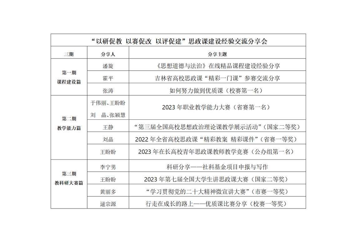 为落实思政课立德树人根本任务,推动我校职业本科教学工作走深走实,进一步提高思政课教师的教学、竞赛、授课能力,近日,思想政治理论教研部组织开展“以研促教 以赛促改 以评促建”课程建设经验交流分享会。本次分享会分三期举行,主要围绕近三年来我校思想政治理论课教学、科研、大赛成果展开,旨在搭建开放共享的平台,深化科研引领教学创新、竞赛激励教学改革、评价促进课程建设的教学改革创新,增强广大思政教师的内驱力,为职业本科建设增效赋能。思政课建设经验分享会(三期)活动安排本次交流分享会以“3+2”的活动形式展开,“3”即分别围绕“课程建设”“教学能力”“教科研大赛”三大主题开展;“2”即每一期活动均覆盖经验分享和观摩研讨2个环节。在经验分享环节,霍平教授、潘旋博士等多位教师代表分别从课程建设、大赛经验及教科研筹备等方面,分享了备赛经验与心得体会。在观摩研讨环节,观摩教师围绕教学方法与设计创新等方面进行深入探讨。与会教师纷纷表示,此次交流分享会不仅开阔了视野,也为各自的教学实践注入了新动力,通过“研赛评”三位一体式的经验分享,激发了教师队伍的创新潜能。第一期分享会——课程建设篇第二期分享会——教学能力篇
